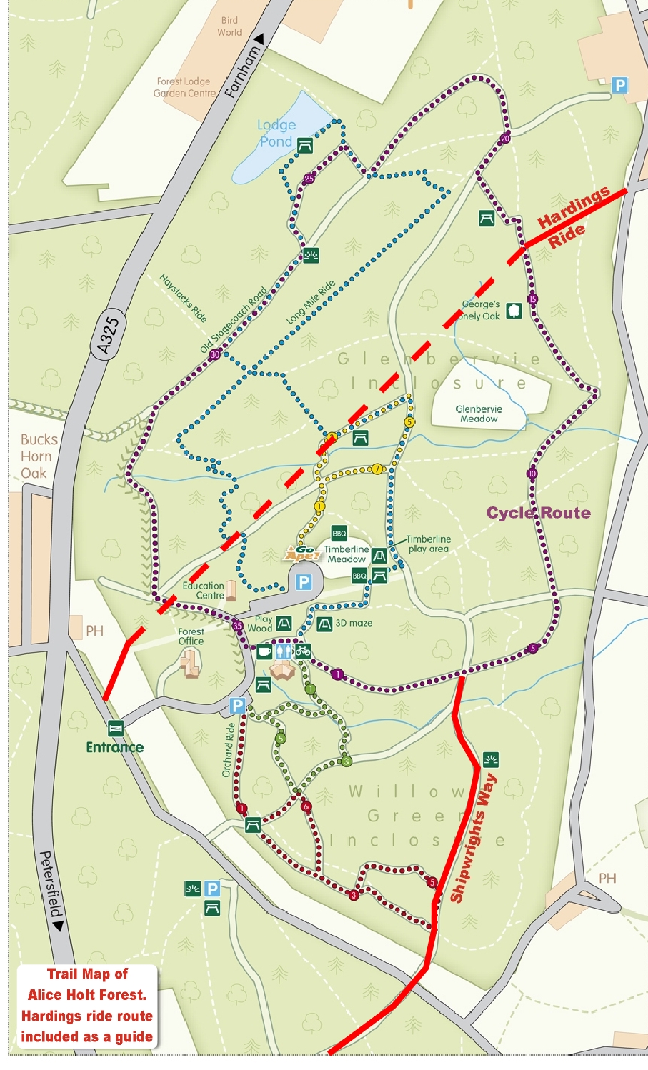 Rowlege. From the back of the car park a trail goes straight to the Alice Holt